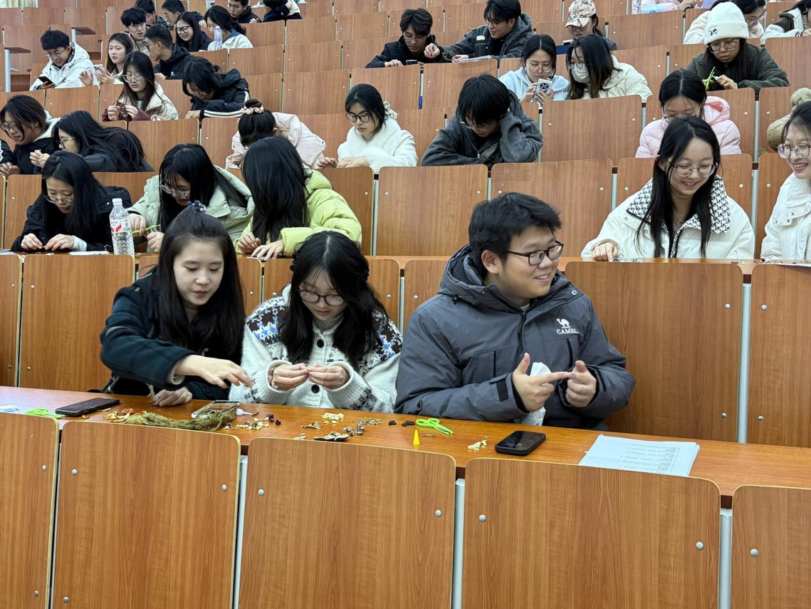 活动现场,同学们精心挑选白芷、百合花、茉莉花等兼具药效与美感的中药材,充分发挥想象力与创意,将一味味药材巧妙搭配、精心构图,再用胶水细心固定在胸针底座上。现场交流讨论声不绝于耳,在轻松愉悦的创作过程中,大家不仅近距离感知了本草的形色之美,更在方寸之间寄托了对中医药文化的独特理解。