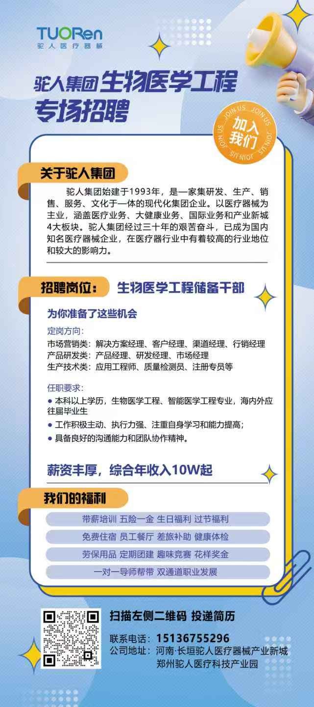 为扎实做好2025届毕业生就业服务工作,助力毕业生实现高质量充分就业,5月22日,驼人集团应邀来我院举办生物医学工程专场招聘会,部分2025届意向毕业生参加了此次活动。