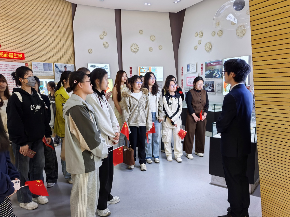 在讲解员的引导下,同学们依次参观了“用信仰托起梦想”“用责任撑起担当”“让使命超越生命”等核心展区。展厅内,一张张珍贵的历史照片、一件件饱含深情的实物展品、一段段感人至深的影像资料,生动再现了王强同志忠诚于党、追求真理、敬业爱生、无私奉献的崇高品格。当听到王强老师在生命最后时刻仍坚持理论研究、笔耕不辍的感人事迹时,现场同学无不动容,深刻感受到一位马克思主义理论工作者对信仰的执着坚守与对教育事业的无限热忱。生物制药25(7)班入党积极分子杜安琪说道:“今天看到王强老师用生命最后的时光坚守讲台和科研,我才明白‘信仰’这两个字的分量。我要脚踏实地钻研专业知识,争取早日成为一名合格的共产党员,在日常学习生活中起到带头作用。”